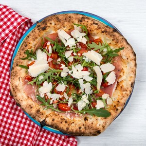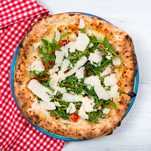 Fior di latte, rucola, pomodorini ciliegino freschi, prosciutto crudo S.Daniele DOP, scaglie di parmigiano DOP, olio EVO