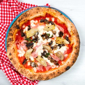 Tomaten, Mozzarella, Pilze, Kochschinken, Artischocken, Basilikum, Öl