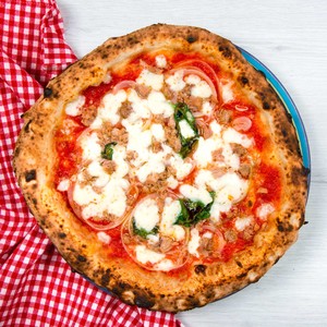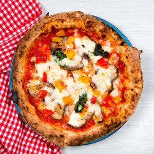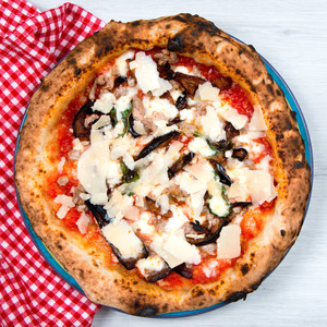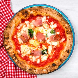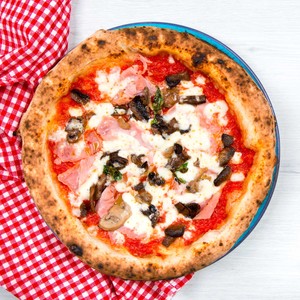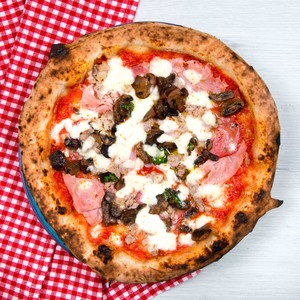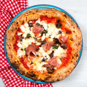 Tomaten, Mozzarella, Gorgonzola Käse, Speck, Pilze, Basilikum, Öl