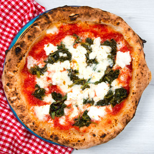 Tomaten, Mozzarella, scharfe Salami, Peperoni, Oliven, Basilikum, Öl